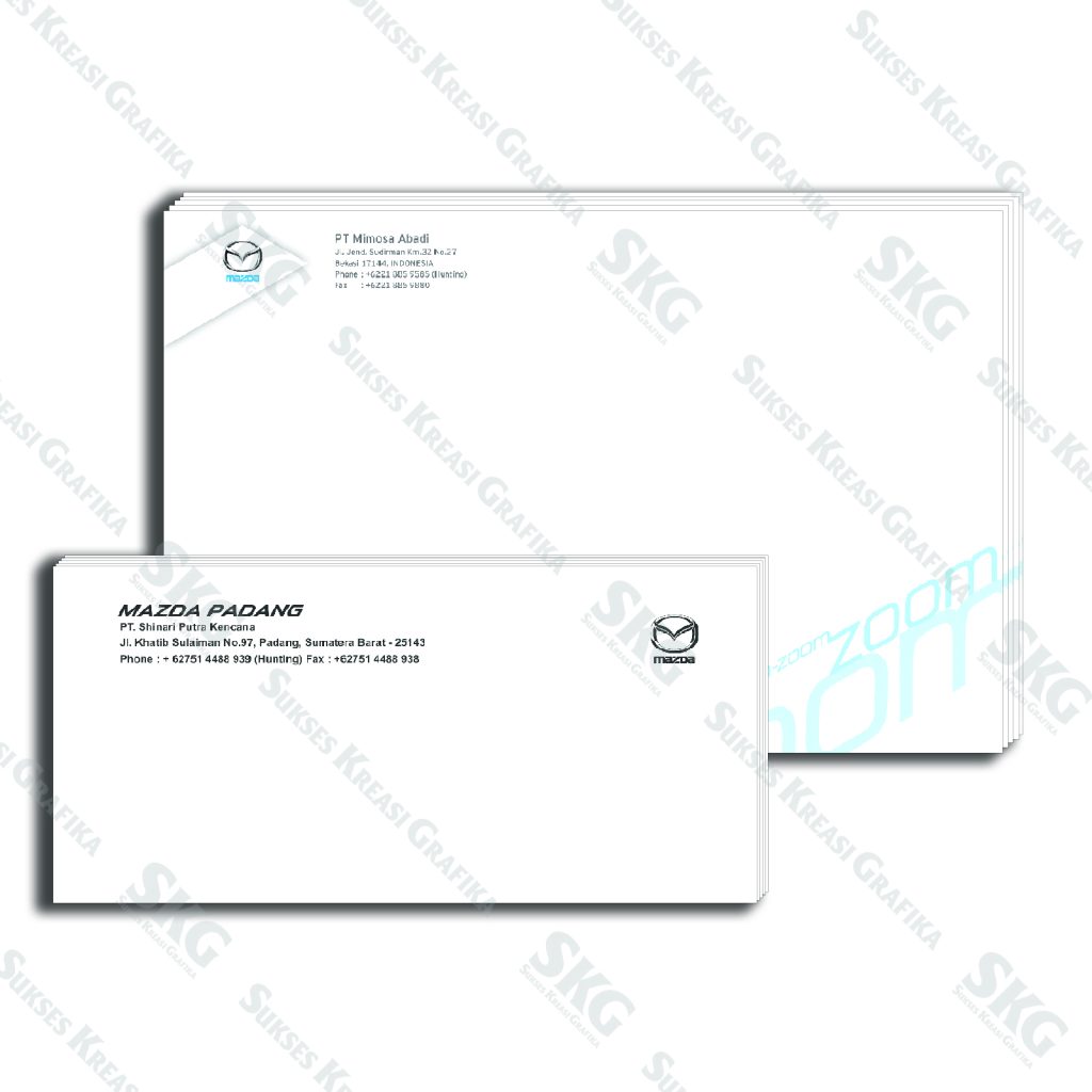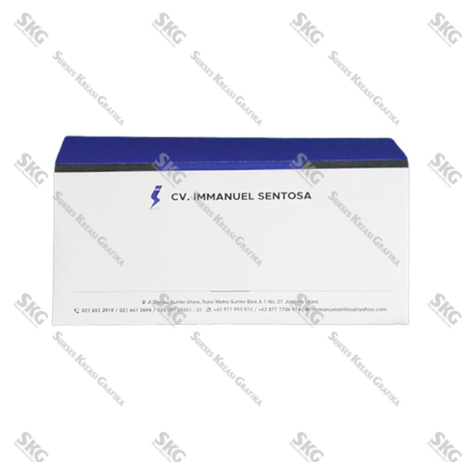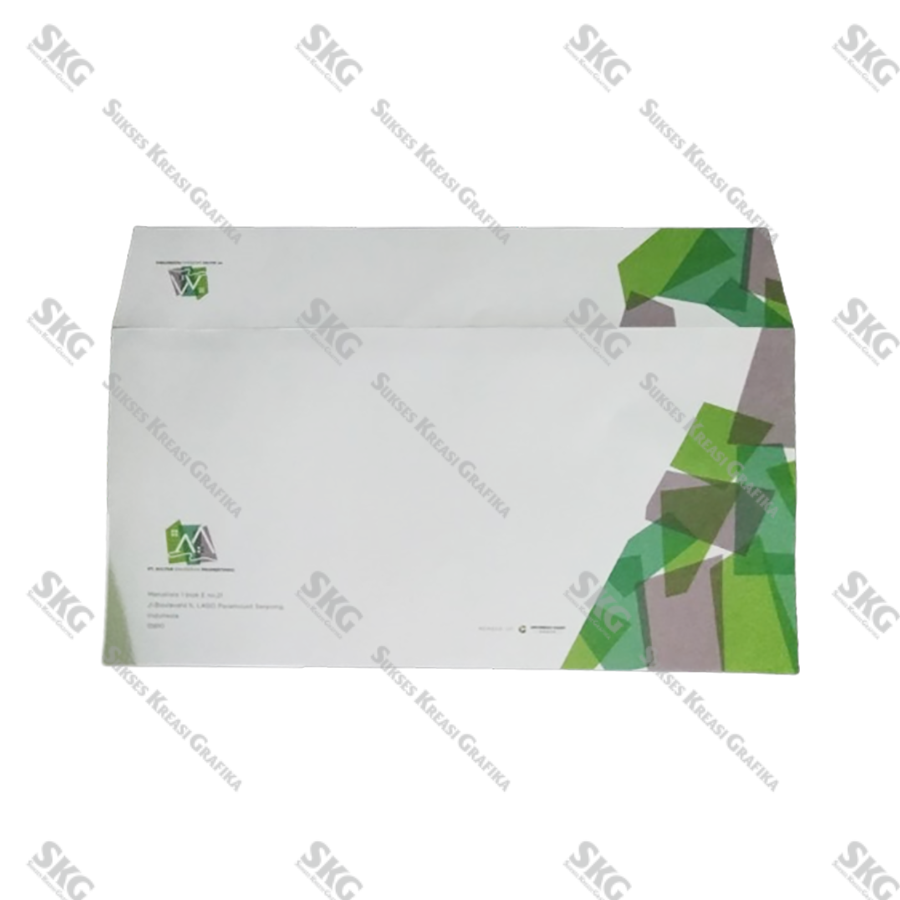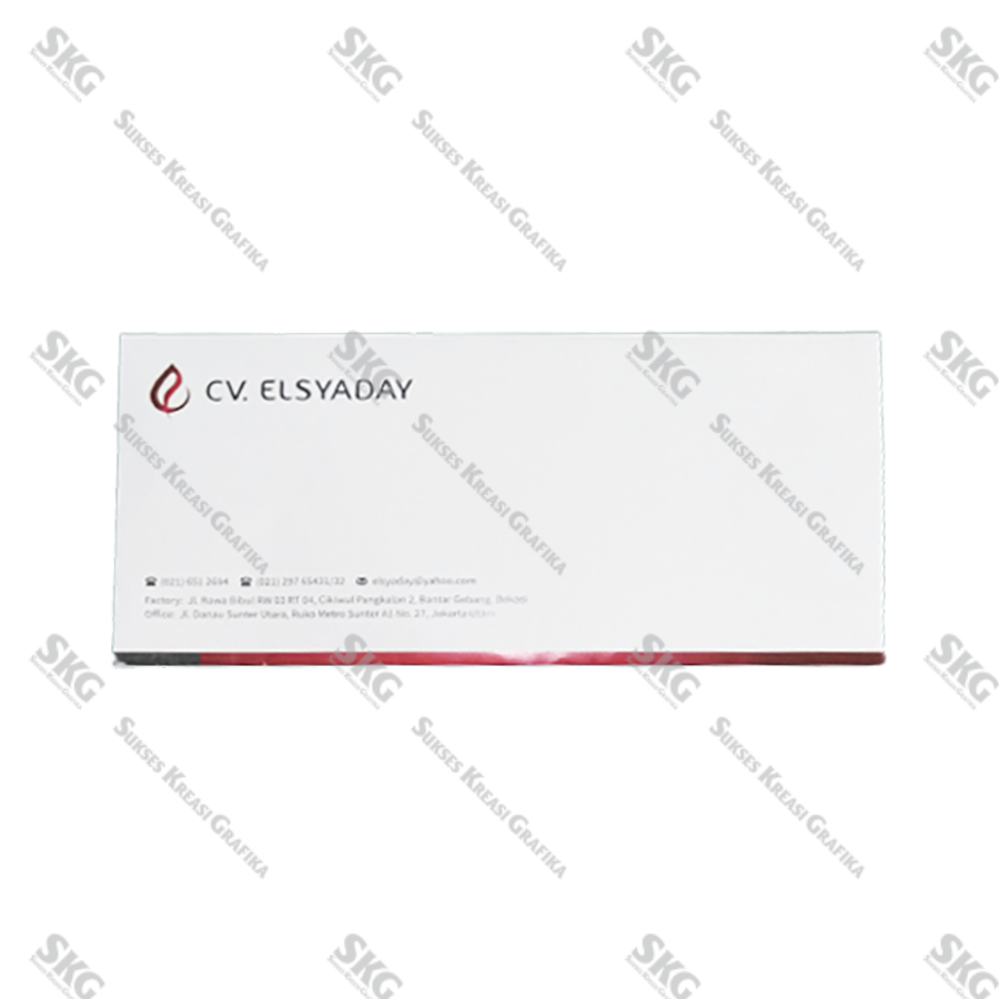 Bahan HVS 70, cetak full warna, ukuran amplop jadi 11 x 23 cm.