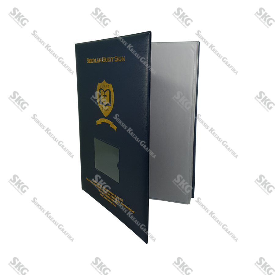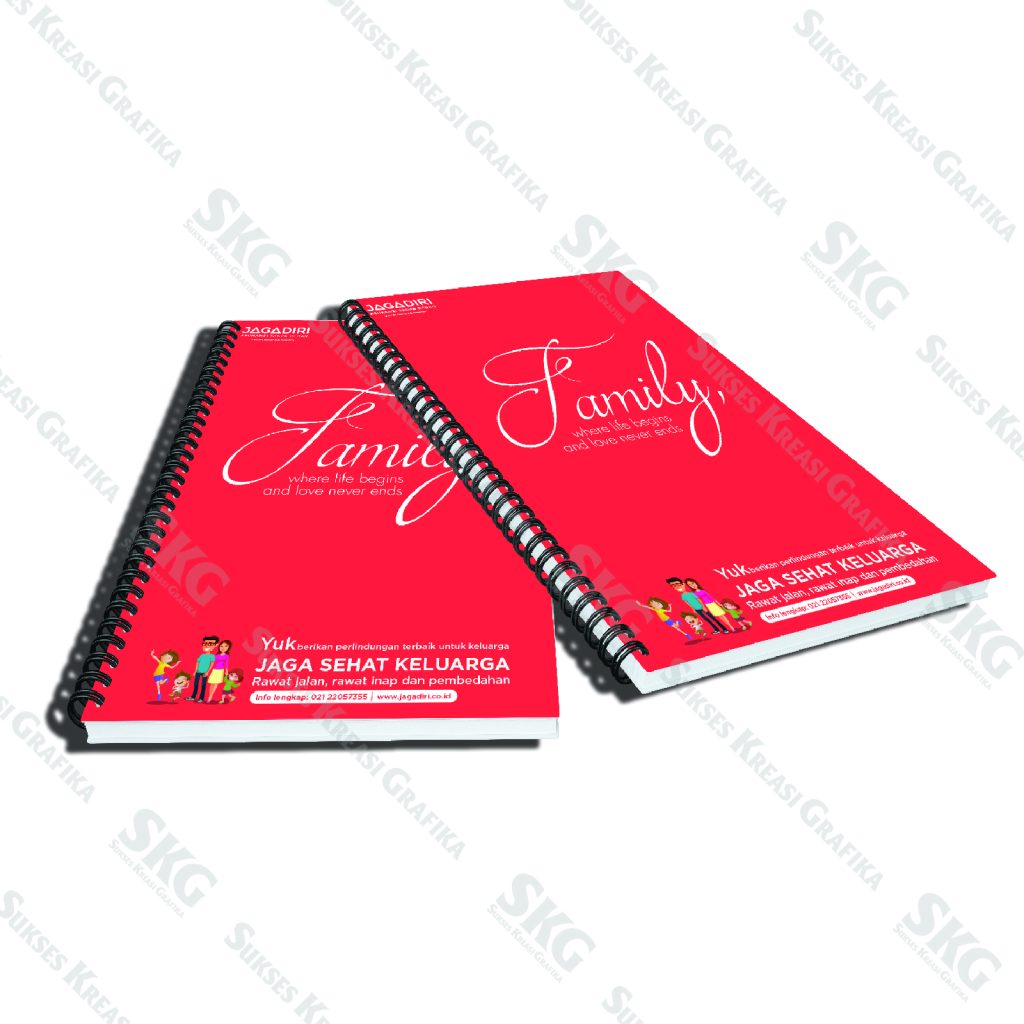 Sampul board dilapisi kulit sintetis, isi kertas HVX, jilid kawat spiral.