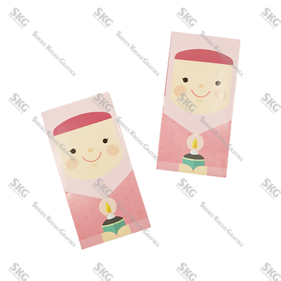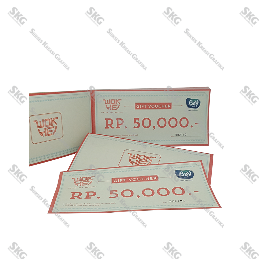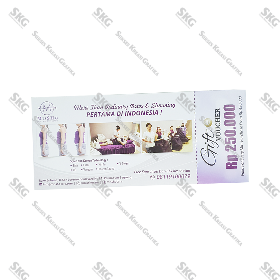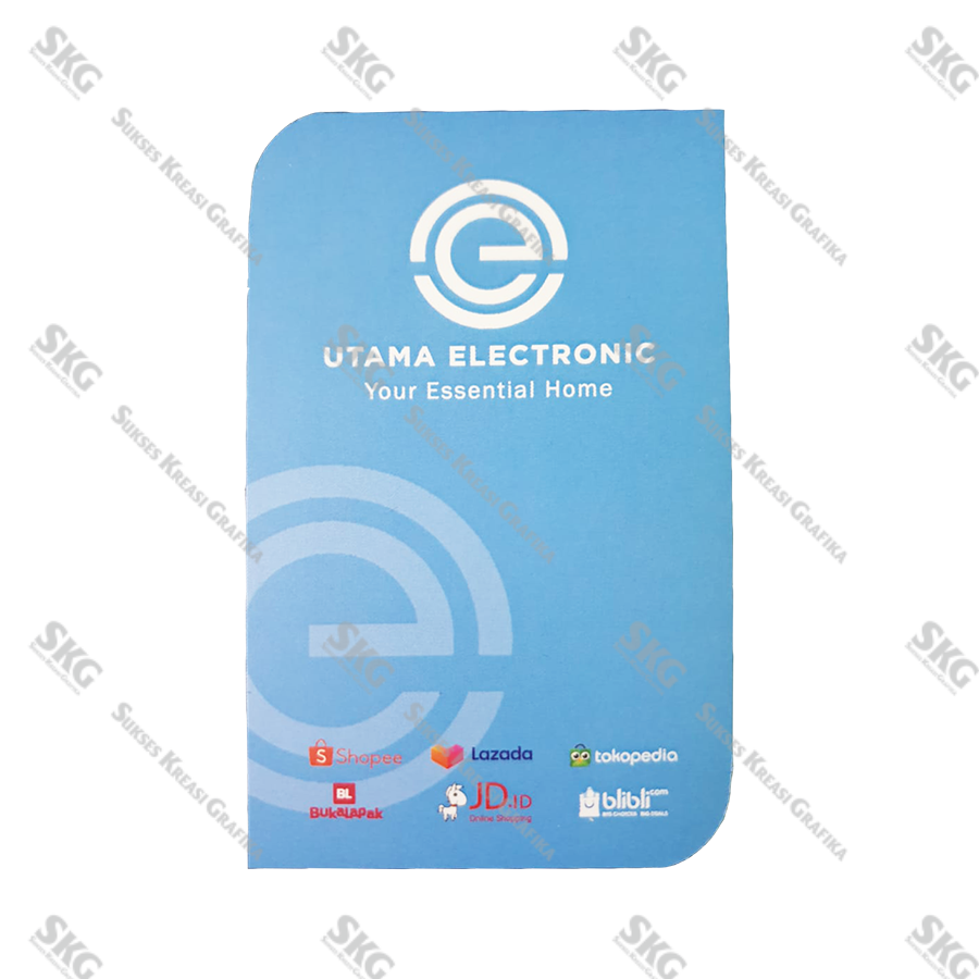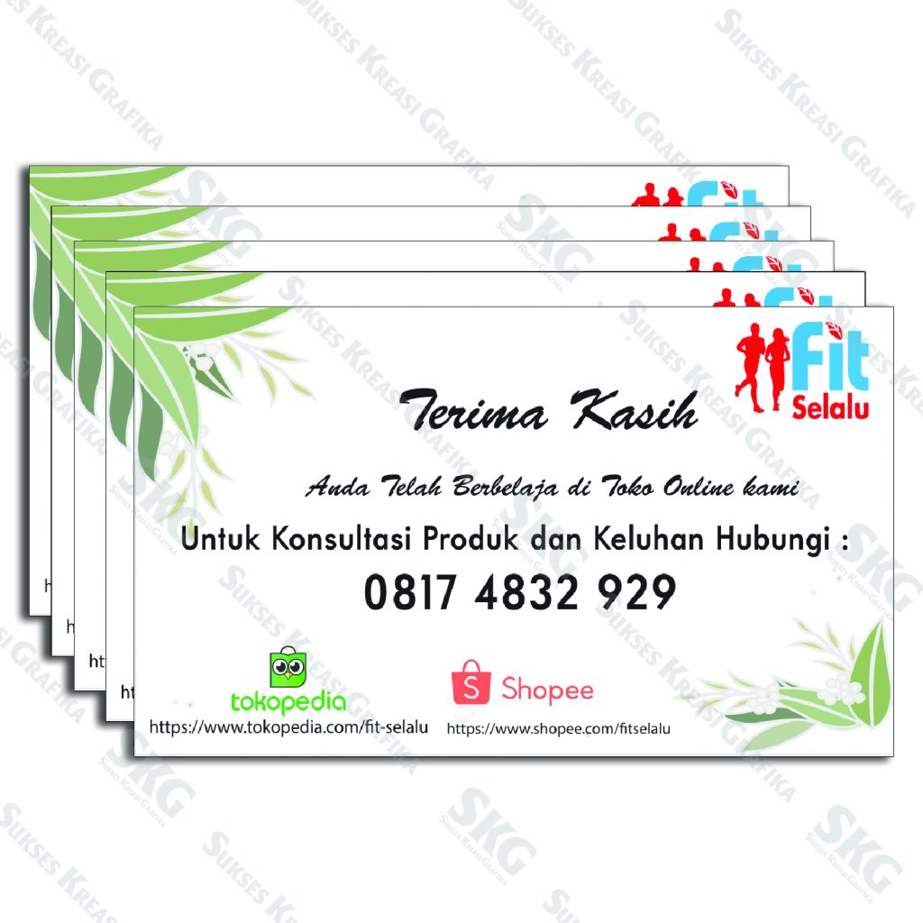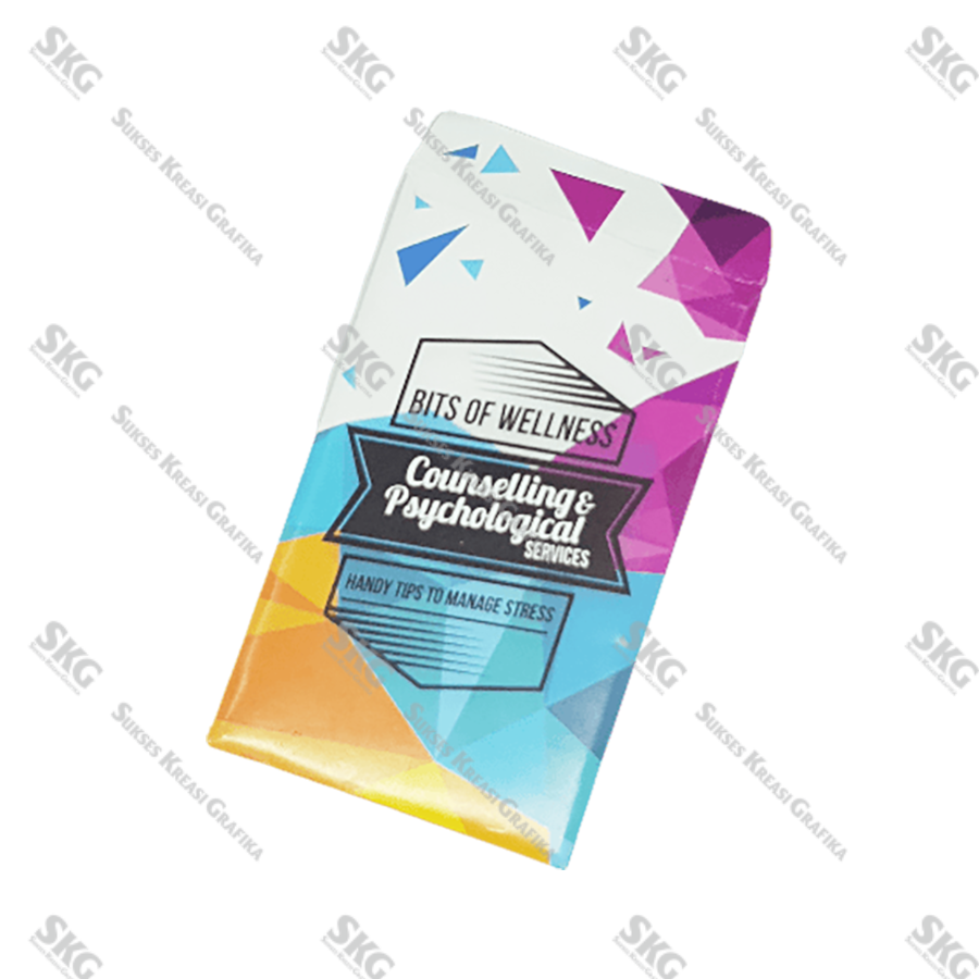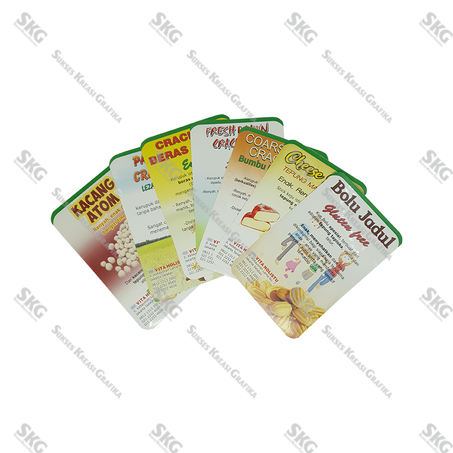 Bahan artcarton 260, finishing glossy, cetak full warna dua sisi.