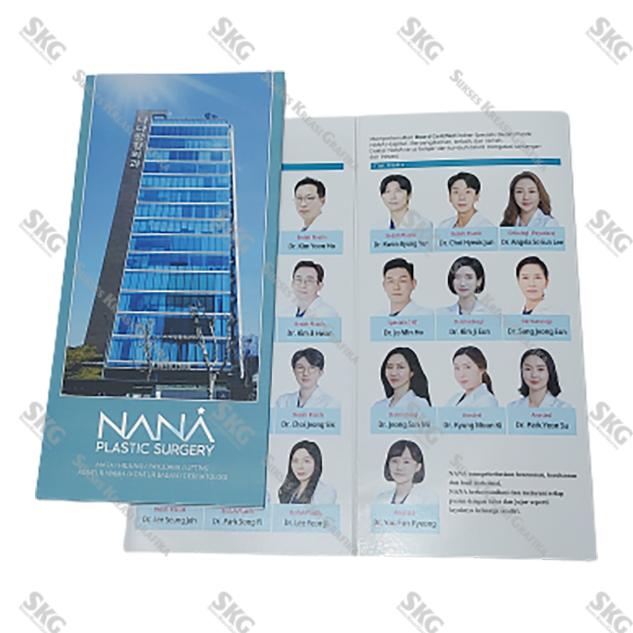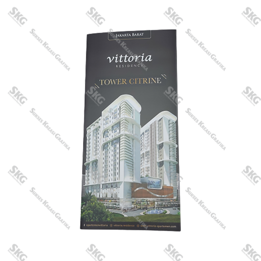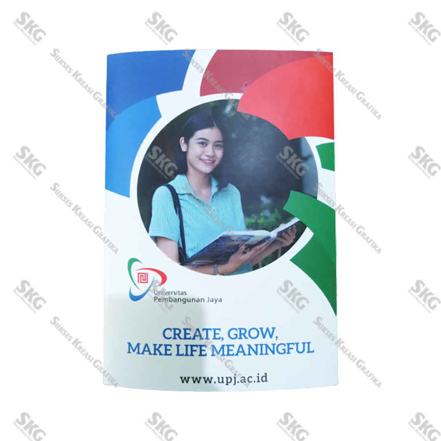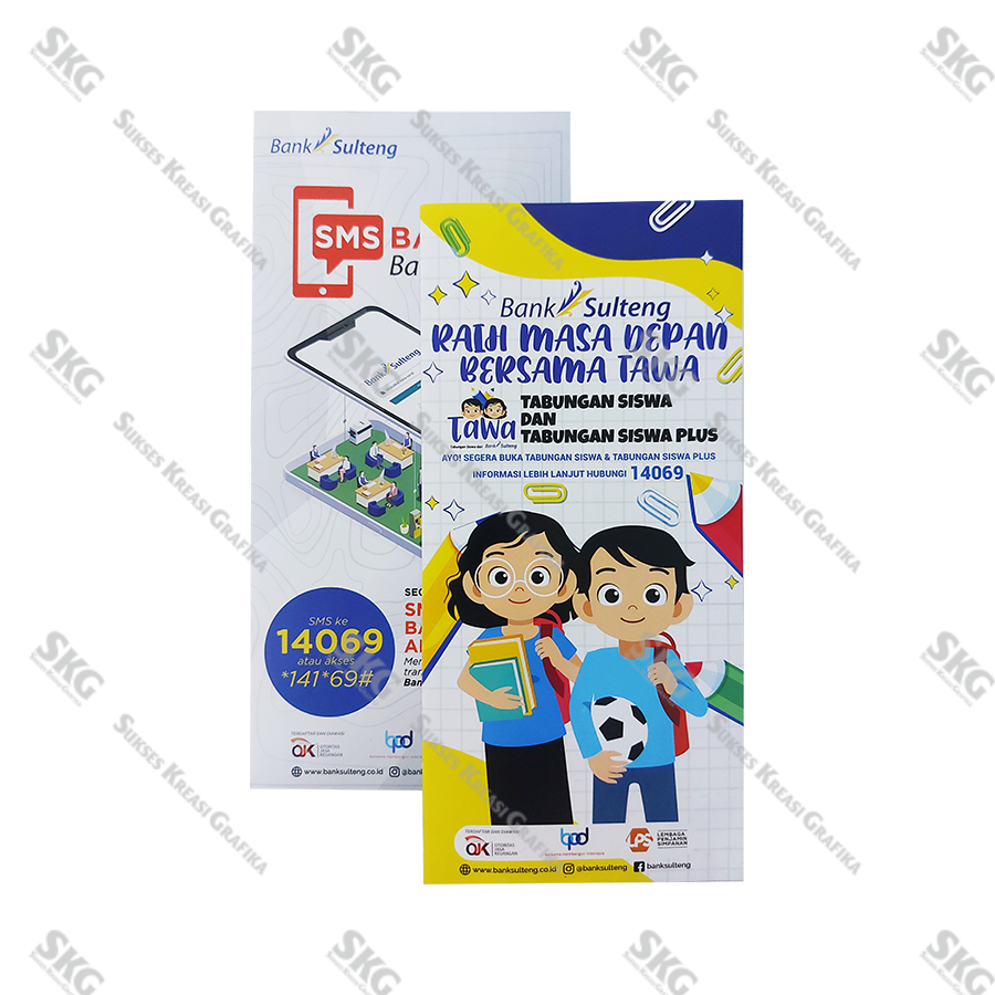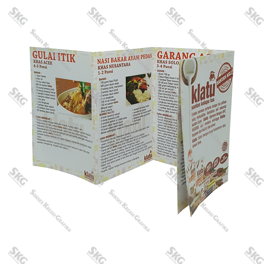 Bahan artpaper 120, cetak dua sisi, full warna, tanpa finishing.