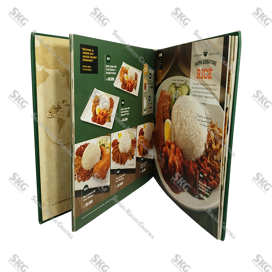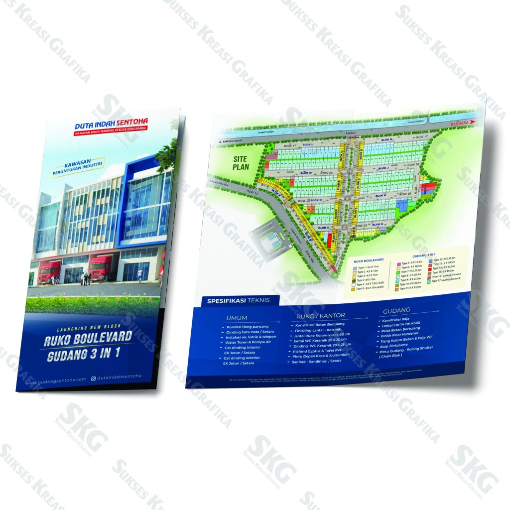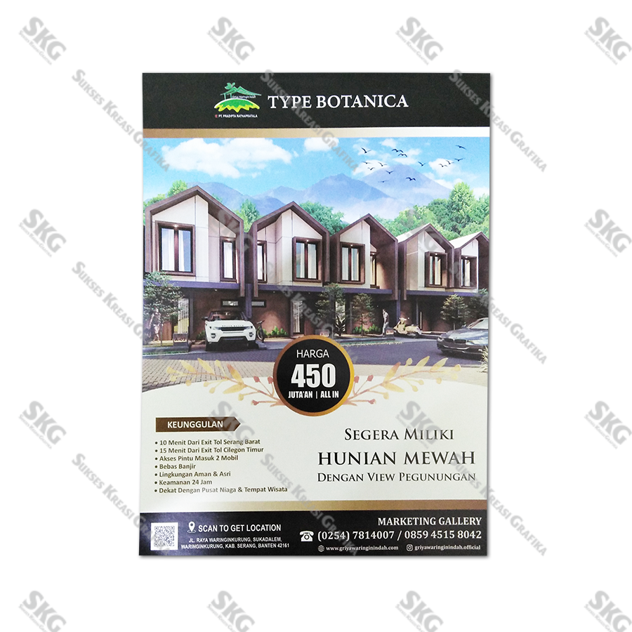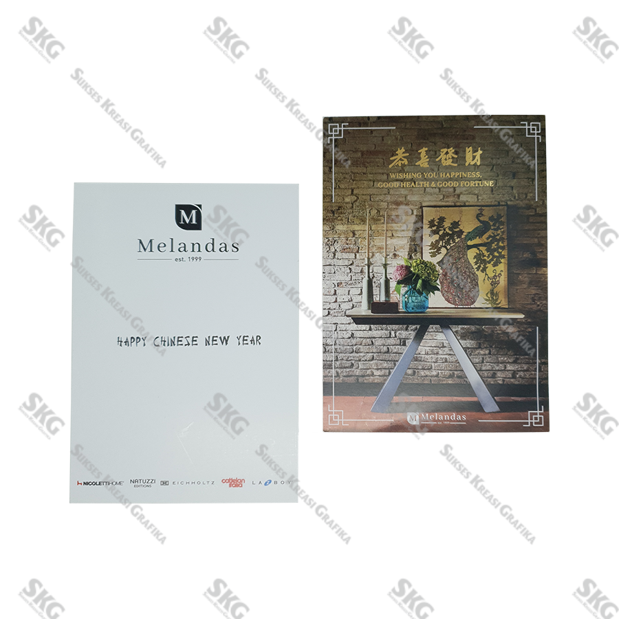 Bahan artpaper 120, cetak dua sisi, full warna, tanpa finishing.