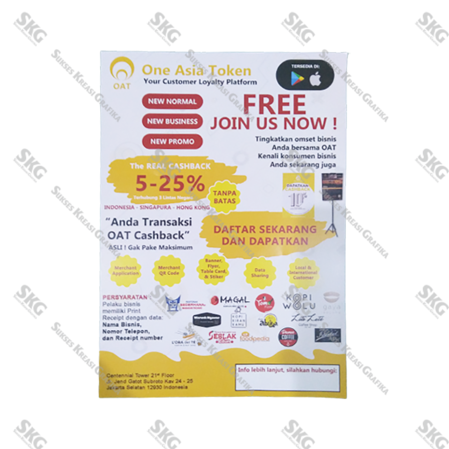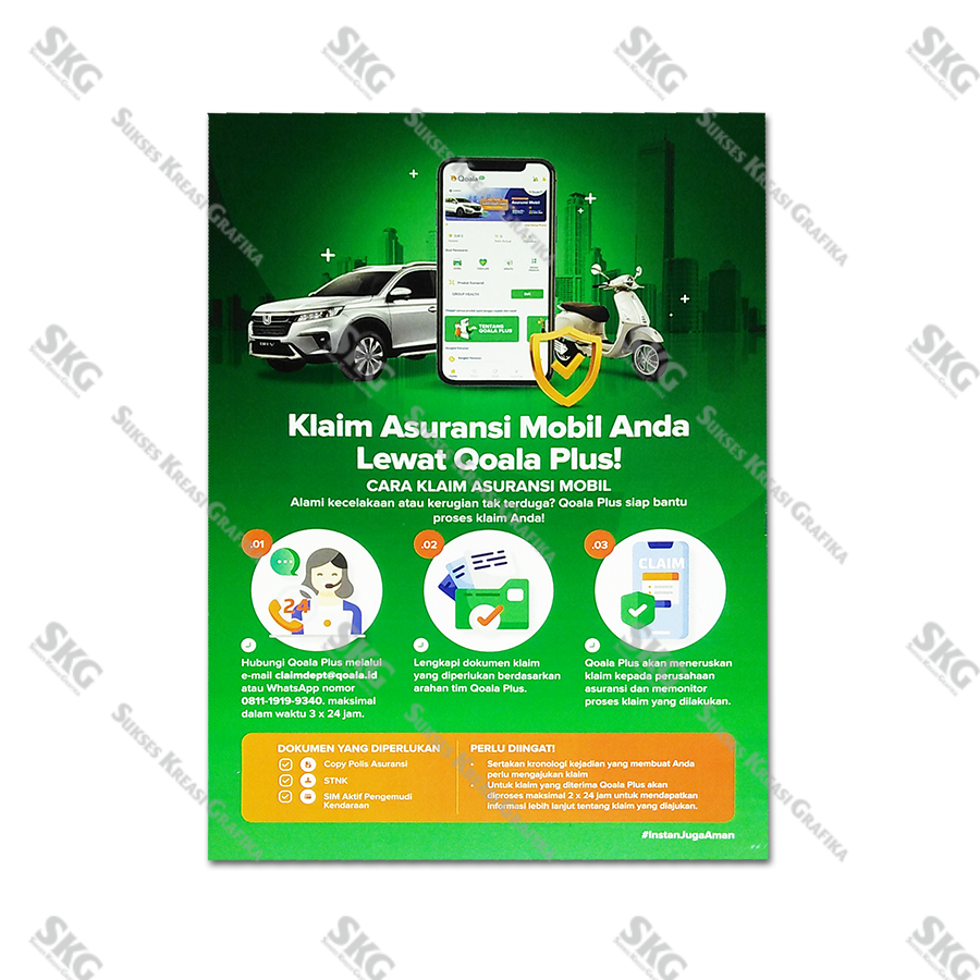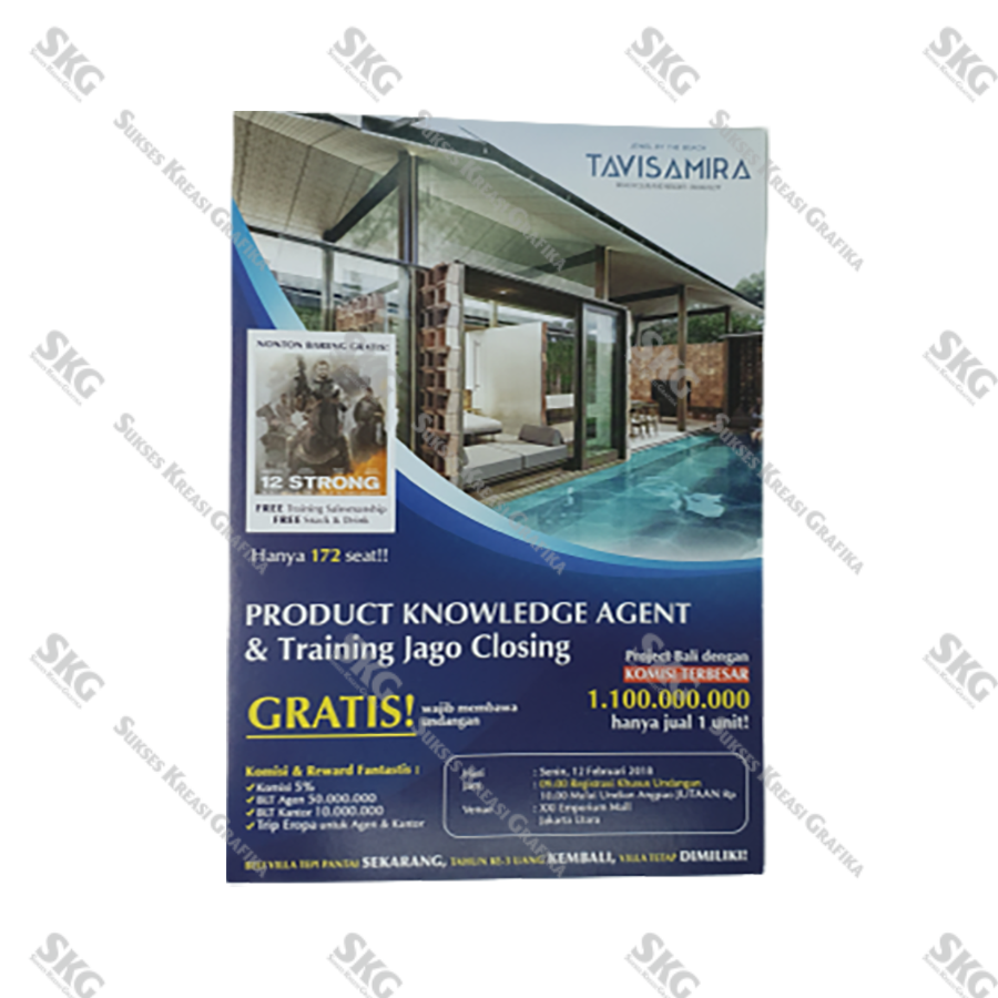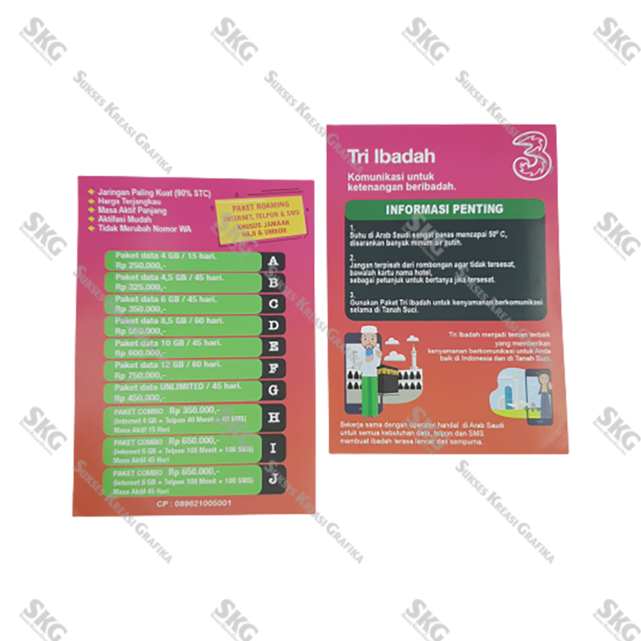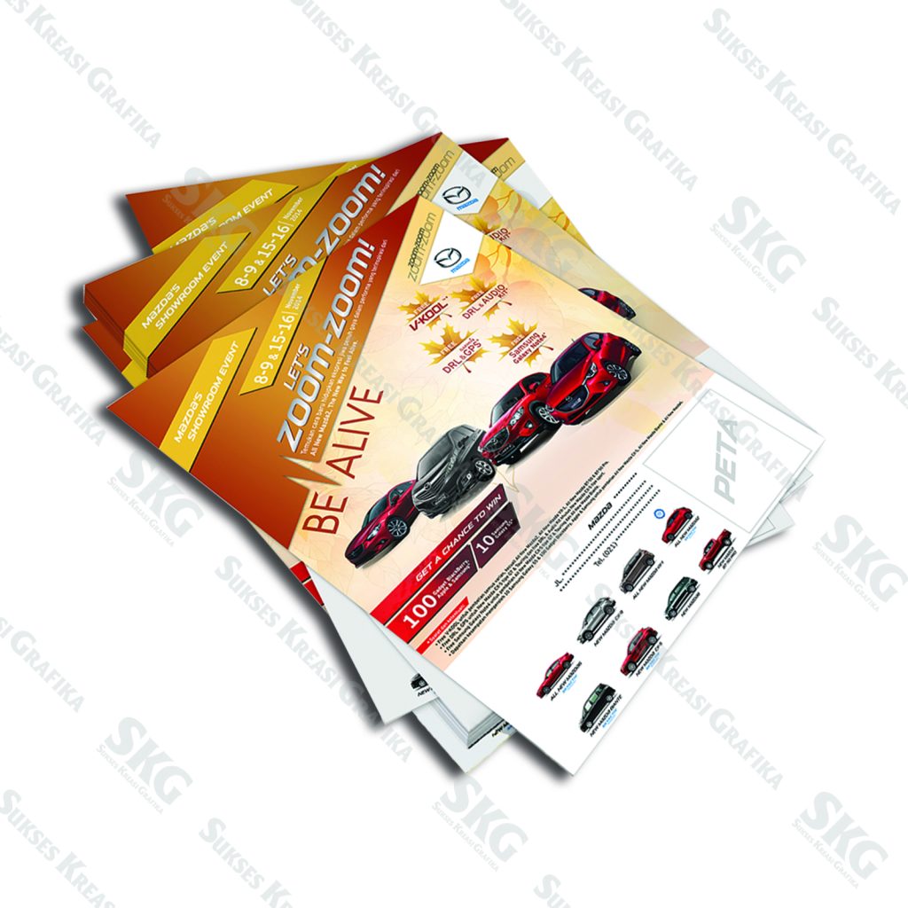 Bahan artpaper 150, cetak dua sisi, full warna, tanpa finishing.
